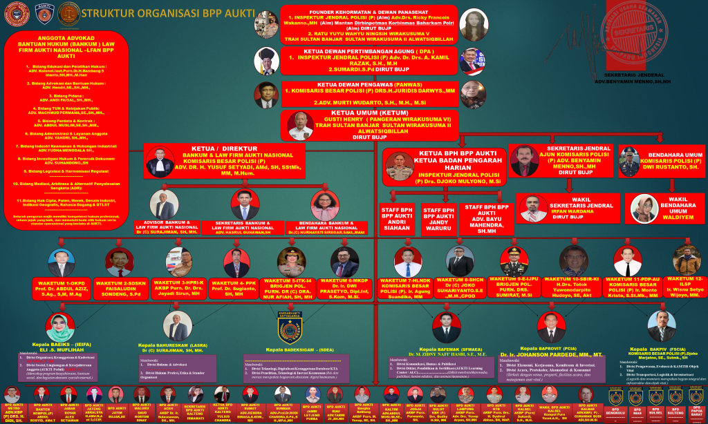 Selain itu, struktur pengawasan dan pendampingan organisasi juga diperkuat oleh unsur perwira tinggi dan perwira menengah Polri, termasuk figur berpangkat bintang dua (Irjen Pol), bintang satu (Brigjen Pol), serta sejumlah Komisaris Besar Polisi (Kombes Pol) KETUA DEWAN PENGAWAS (PANWAS) KOMISARIS BESAR POLISI (P) DRS.H.JURIDIS DARWYS.,MM, KETUA / DIREKTUR BANKUM & LAW FIRM AUKTI NASIONAL KOMISARIS BESAR POLISI (P) ADV. DR. H. YUSUF SETYADI, AMd, SH, SStMk, MM, M.Hum. WAKETUM 7-HLNDK KOMISARIS BESAR POLISI (P). Ir. Agung Suandika, MM , WAKETUM 11-PDP-AU KOMISARIS BESAR POLISI (P) Ir. Monto Kristo, S.St.Mk., MM , KOMISARIS BESAR POLISI (P).Djoko Marjatno, SE., Sstmk., SH yang menempati posisi strategis sebagai penasihat, pengawas, maupun pengarah kebijakan.