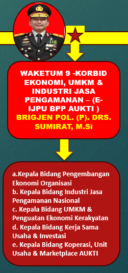 Struktur Bidang di Bawah Wakil Ketua Umum IX, Brigjen Pol. (P) Drs. Sumirat, M.Si, Koordinator Bidang Ekonomi, UMKM & Industri Jasa Pengamanan (E-IJPU),Untuk melaksanakan tugasnya, Waketum Koordinator membawahi bidang-bidang berikut: