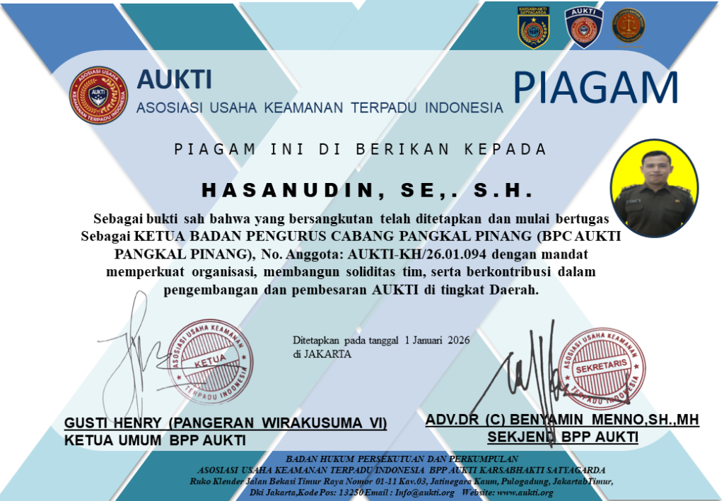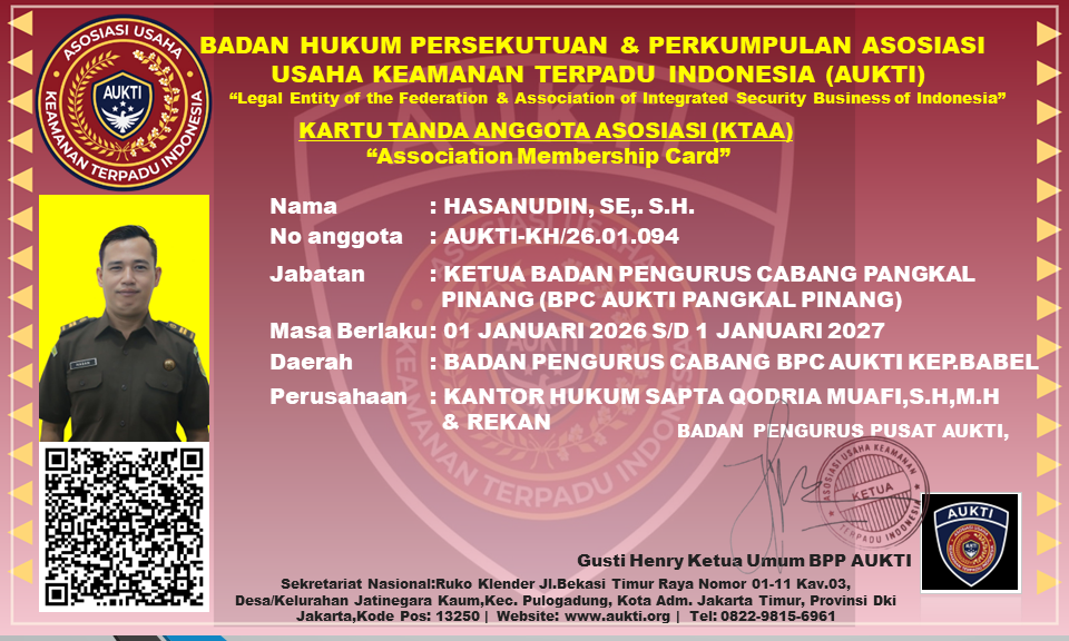 Anggota ini terverifikasi dan tercatat secara sah sebagai anggota aktif Badan Hukum Persekutuan dan Perkumpulan Asosiasi Usaha Keamanan Terpadu Indonesia (AUKTI).“Legal Entity of the Federation & Association of Integrated Security Business of Indonesia”