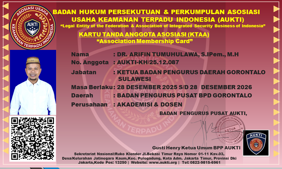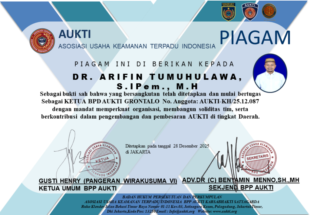 Dr. Arifin Tumuhulawa, S.IPem., M.H resmi ditetapkan sebagai Ketua Badan Pengurus Daerah (BPD) Asosiasi Usaha Keamanan Terpadu Indonesia (AUKTI) Provinsi Gorontalo untuk masa bakti 28 Desember 2025 hingga 28 Desember 2026.