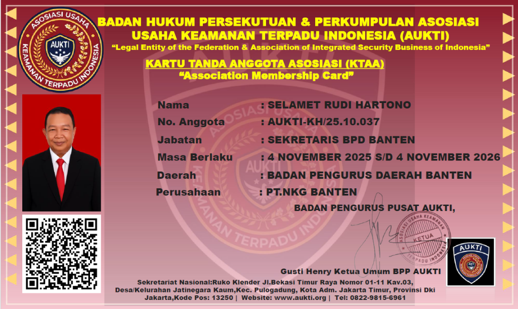 Anggota ini terverifikasi dan tercatat secara sah sebagai anggota aktif Badan Hukum Persekutuan dan Perkumpulan Asosiasi Usaha Keamanan Terpadu Indonesia (AUKTI).“Legal Entity of the Federation & Association of Integrated Security Business of Indonesia”